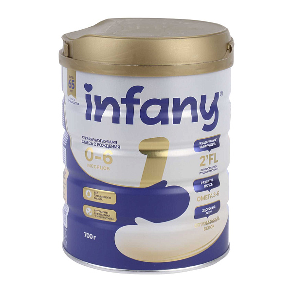Молочная смесь Infany 1 предназначена для малышей с рождения до 6 месяцев. Внутри баночки предусмотрен держатель для мерной ложечки и уголок-ограничитель, что способствует легкой и точной дозировке смеси.