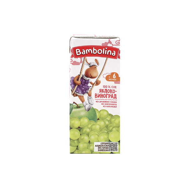 Напиток «Яблоко-белый виноград» бренда Bambolina изготовлен из концентрированных соков белого винограда и яблока. В его составе нет сахара, красителей и консервантов, поэтому напиток можно предложить детям старше 6 месяцев. Приятный сладкий привкус сока достигается с помощью натурального сахара. Упаковка – пакеты «тетрапак» объемом 200мл. Такой порции хватает для разового приема ребенком. Яблоко и виноград богаты витамином С, содержат полезные микроэлементы. Энергетическая ценность – 40 ккал на 100 грамм. Рекомендуется детям с 6 месяцев.