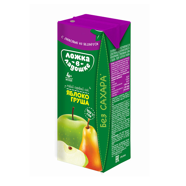 Комбинация яблочного и грушевого сока делает конечный продукт «Ложка в ладошке» более мягким на вкус и придает соку насыщенный аромат. Яблочно-грушевый сок «Ложка в ладошке» не разочарует малыша фруктовым букетом и чистой консистенцией. Сок на 100 процентов изготовлен из яблок и груш, которые являются ценными источниками витаминов группы В и К, а также железа, фосфора, калия и кальция. Сок приготовлен без добавления сахара. Объема в 200 мл хватит, чтобы утолить жажду.