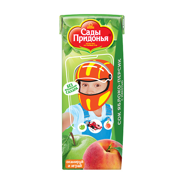 Сок Сады Придонья «Яблоко-персик» с мякотью порадует детей и взрослых отличным вкусом, необычным фруктовым сочетанием и натуральным составом. Рекомендуется для употребления детьми в возрасте старше 5 месяцев. В рецептуре нет подсластителей, использованы только сахара природного происхождения. При производстве сохраняются все полезные свойства фруктов. Удобный в употреблении благодаря компактной упаковке. Содержит набор витаминов: железо, витамин С, калий, каротин. Индивидуальную упаковку сока удобно брать с собой на прогулки, в поездки, в гости, школу или детский сад.