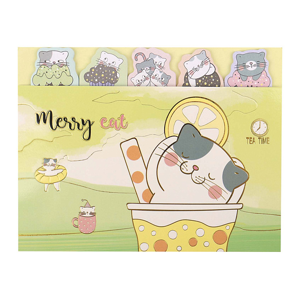 В наборе представлено восемь видов стикеров по 20 листов каждого с различными веселыми изображениями котиков. Маленькие стикеры можно использовать для маркировки страниц или создания заметок, а большие — для записи важных дел и целей.