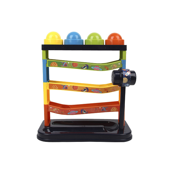 На яркой разноцветной платформе в виде вертикального лабиринта есть четыре отверстия, в которые при помощи молоточка нужно забивать шарики.