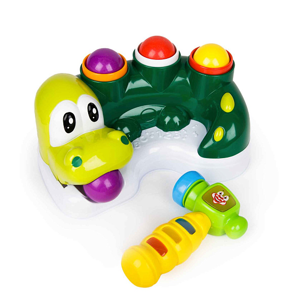 Стучалка-крокодил оснащена световыми и звуковыми эффектами и сортером. Она способствует развитию навыков мелкой моторики, логического мышления, координации, а также влияет на слуховое и визуальное восприятие малыша. У игрушки яркий привлекательный дизайн в виде маленького крокодила. Чтобы начать играть, вставьте шарик в отверстие сортера и ударьте по нему молоточком, шарик прокатится внутри крокодила и выкатится обратно через его рот. Во время удара молоток будет издавать различные веселые звуки и подсвечивается несколькими цветами.
