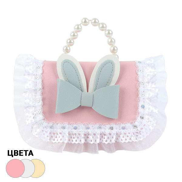 Красивая детская сумочка в пастельных тонах с декоративными элементами – мечта юной модницы и радость для мамы. Основной нежный цвет сумки дополнен акцентами в виде голубого бантика и ушек. Ручка сумочки выполнена из имитации жемчужных бусин, добавляя элегантности общему образу. Кайма украшена белым кружевом с мелкими блестками, что придает изделию праздничный и игривый вид.