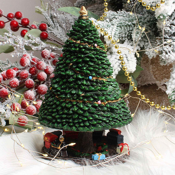 Светящаяся композиция классического дизайна, выполненная из полирезина, диаметром 10 см. Изделие представляет собой объемную елку с детальной имитацией иголок, украшенную миниатюрными цветными шарами и золотистой гирляндой. Вокруг основания размещен небольшой игрушечный поезд с подарками, создающий атмосферу праздника и уюта. Елка оснащена подсветкой, которая мягко светится, подчеркивая детали и создавая волшебное настроение. Батарейки в комплект не входят