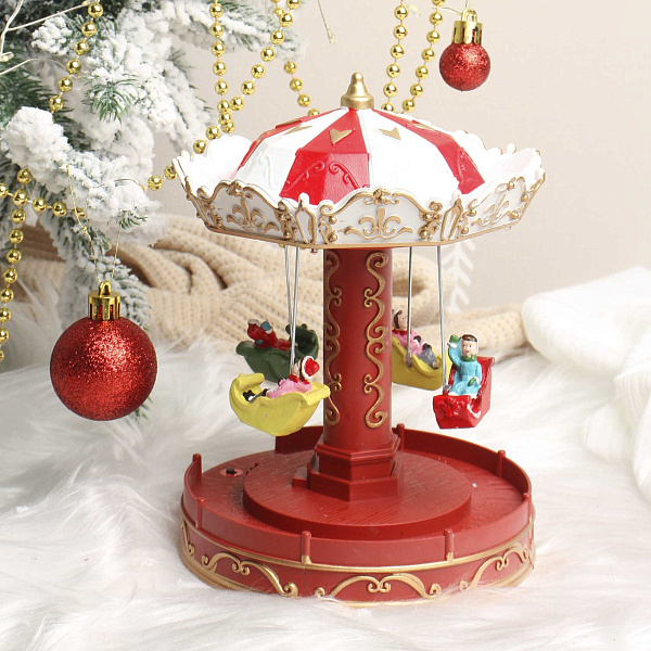 Новогодний сувенир «Карусель» выполнен в классическом стиле и украшен красными, белыми и золотыми элементами. Вокруг центральной колонны расположены качели с фигурками детей. Высота изделия составляет 19 см. Мягкая подсветка и мелодия создают уют и тепло.