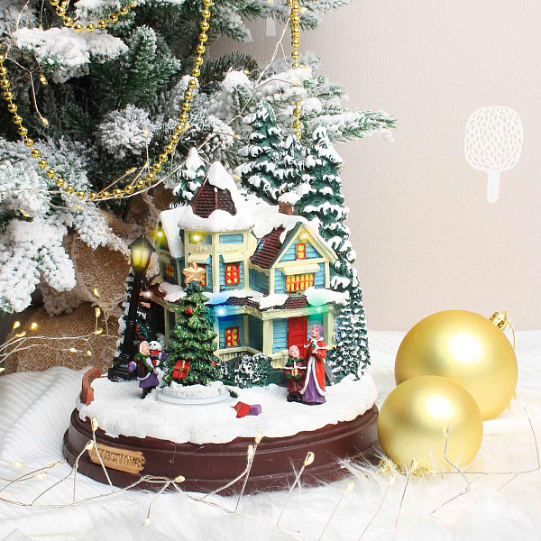 Новогодний сувенир «Коттедж» представляет собой декоративную композицию с изображением загородного домика, окруженного снежными елками и фигурками людей. В оформлении используются яркие детали: фигурка снеговика, рождественская елка, фонарный столб, создающие праздничное настроение. Подсветка украшения работает от сети, благодаря чему мелкие элементы и окна светятся мягким светом.