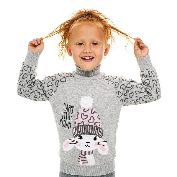 Свитер с изображением милого кролика на груди и сердечек на рукавах делает образ девочек очень привлекательным. Производитель выбрал светло-серые универсальные тона, этот цвет идет практически всем. Вещь теплая и удобная, высокому ворот защищает от продувания. Свитерок подойдет для межсезонья, в холодное время года его надевают под куртку, можно носить с брюками или юбками. Вещь сделана из хлопка с небольшим количеством нейлона, этот материал способствует поддержанию ее формы после стирки.