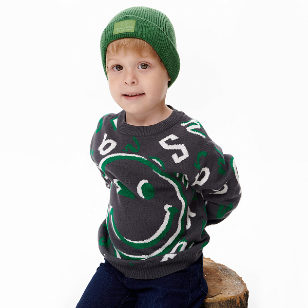 Свитер для мальчика с ярким и оригинальным дизайнерским рисунком согреет малыша в холодное время года. Основной цвет — серый, украшен крупными изображениями смайликов и абстрактных символов белого и зеленого цветов, что придает изделию игривость и стиль.