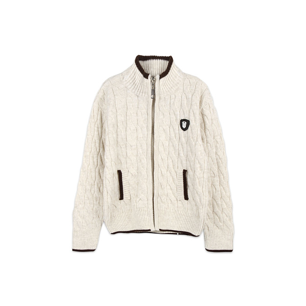 Теплый вязаный свитер сохранит тепло даже в сильные морозы. Он хорош в сочетании с другими видами одежды и обуви. Свитер выглядит модно и стильно. Силуэт изделия прямой с зауженным низом, рукава с высокими манжетами, горловина с низким воротником. Свитер имеет сквозную застежку «молния», внизу проложена широкая трикотажная резинка. По бокам имеются два вместительных кармана вертикального исполнения. Изделие классического светло-серого цвета. Его низ, края рукавов, карманы и ворот декорированы черным кантом, который дополняет дизайн. Ткань выполнена из полиэстера, натуральной шерсти и эластана.