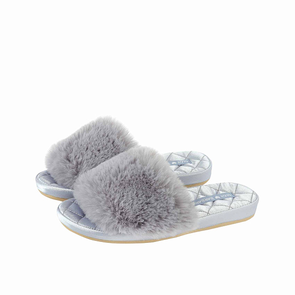 Верх декорирован пышным искусственным мехом. Стеганая стелька и подкладка изготовлены из текстильного полотна. Материалы не препятствуют естественной циркуляции воздуха, не нуждаются в сложном уходе. Вырез в области пальцев и открытая пятка гарантируют комфорт в течение дня.