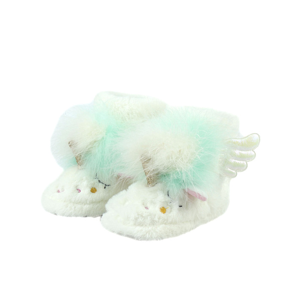Очаровательные домашние сапожки станут чудесным подарком для ребенка ясельного возраста. Изготовлены они из белого текстильного материала и выглядят словно меховые сапоги. На носках обуви нанесен принт в виде выразительных бока домашних сапог декорированы стилизованными крылышками. Главное достоинство сапожек – в них можно малышу ходить даже по холодному полу, не опасаясь простудиться. Подошва гибкая, изготовлена из ТПР, она убережет ребенка от скольжения. Высокие голенища не только утепляют ноги, но и предохраняют от случайных ударов.