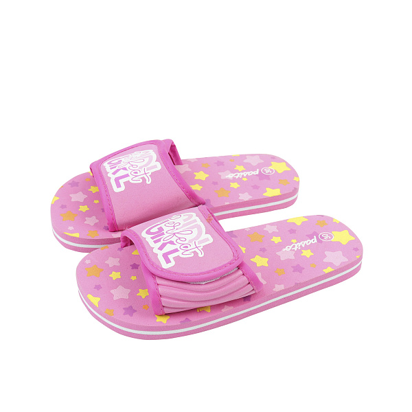 Пляжные шлепанцы предназначены для девочки. Яркий дизайн поднимет ребенку настроение, поможет настроиться на активный отдых. Для оформления использованы насыщенные цвета, нарисованные звездочки и графические надписи. Верхняя часть снабжена удобной липучкой, позволяющей отрегулировать полноту. Таким образом обеспечивается комфортная посадка, исключается потеря обуви.