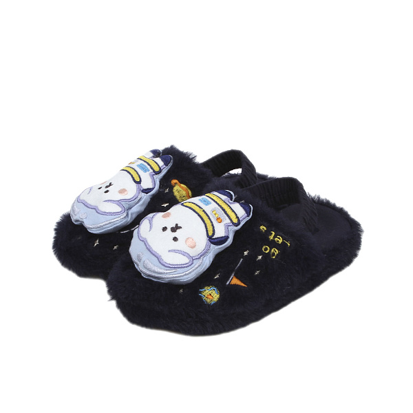 Домашние тапочки оригинальной формы и необычного дизайна станут любимой обувью мальчика младшего возраста. Внешне тапочки похожи на диковинного пушистого зверька с густой темно-синей шерстью. На носках пантолет зафиксированы объемные белые фигурки собачки.