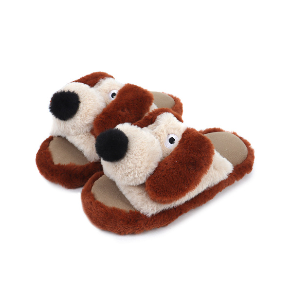 Тапочки «Собачки» имеют забавный внешний вид. Верх выполнен из мягкого текстиля коричневого и бежевого цветов. На передней части — объемная мордочка собаки с черным носиком и белыми глазками. Носок открытый, что позволяет ногам дышать. Подошва светло-бежевая, не скользит по полу. Идеальны для дома.