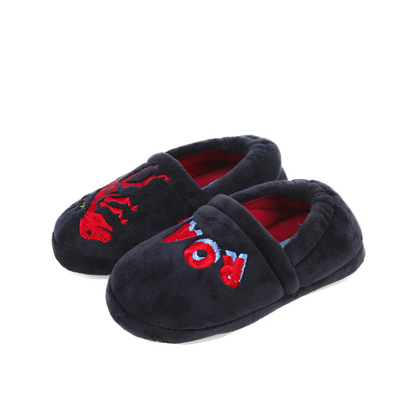 Цвет тапочек – темно-синий, носки украшены красным принтом с динозаврами.