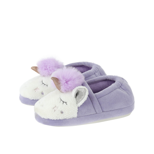 Детские домашние туфли для девочек с единорогом. Модель закрытого типа. Выполнена из мягкой синтетической ткани. Она приятна на ощупь, создает ощущение уюта при носке. Сзади на пятке вшита резинка, которая помогает фиксировать обувь на ноге и не дает ей сползать. Туфли удобные и легкие, они почти не чувствуются на ноге. В них одинаково комфортно в теплое и холодное время года.