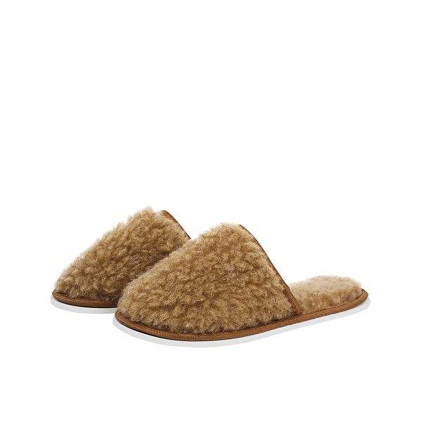 Тапочки предназначены для ребенка школьного возраста. Они имеют закрытый мысок без задников и боковины. Материал изготовления – текстиль и искусственная шерсть. Прямая тонкая подошва без каблука выполнена из ПВХ. Ее верх в месте соединения со стелькой окантован тесьмой. Подошва не скользит, выдерживает многократные сгибания. Ее стелька утеплена искусственным мехом. Такие тапочки предназначены для повседневного использования дома или на даче в холодный сезон. Ногам в них будет тепло и уютно. Цвет изделия светло-коричневый, подошва белая.