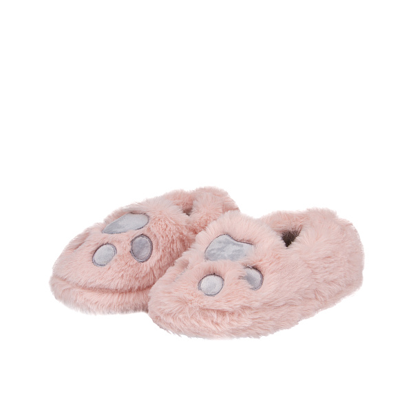 В качестве декора с наружной стороны используется аппликация из серого велюра, окантованного машинной строчкой в форме следа от кошачьей лапки. Прочная подошва надежно защитит тапочки от износа и обеспечит тепло детским ногам.