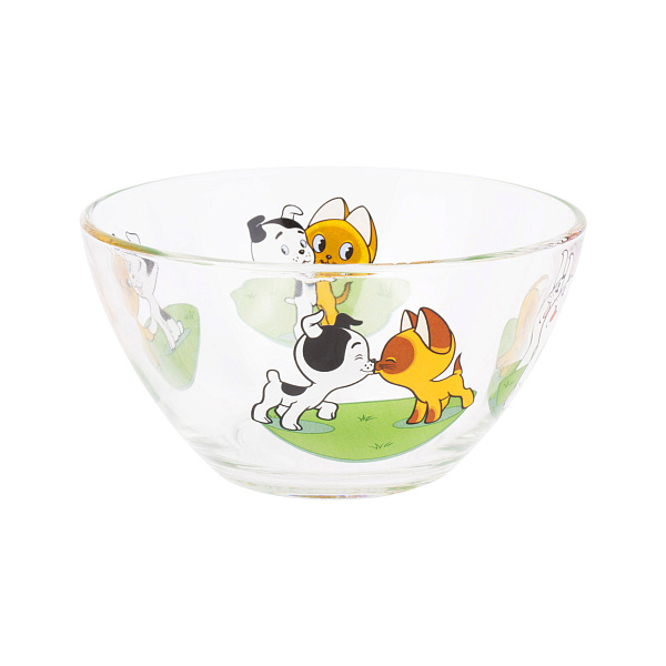 Детская посуда важна для правильной мотивации и чудесного настроения во время еды – оригинальная тарелка с верными друзьями котенком и щенком из популярного советского мультфильма станет подходящим вариантом. Глубокий салатник с высокими бортиками изготовлен из толстого прозрачного стекла и украшен четырьмя разными картинками по периметру. Тарелка подойдет как для первых, так и для вторых блюд, а также салатов и фруктов. Ребенок будет с радостью торопиться за стол, чтобы воспользоваться такой красочной посудой. Такую тарелку можно мыть вручную или в автоматической посудомоечной машине. Для сохранения картинок не рекомендуется использовать абразивные чистящие средства.