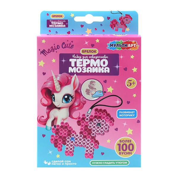 Набор для творчества «Термомозаика. Пони» — это увлекательное занятие, позволяющее создать яркий и красочный брелок в виде милого пони с помощью пластиковых бусин. В комплект входят прозрачная пластиковая основа с отверстиями, набор разноцветных бусин, карточка-шаблон с рисунком, калька, пинцет и подвеска для брелока.