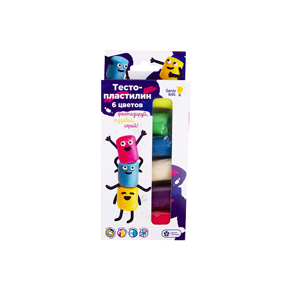 Мягкая субстанция теста-пластилина приятна на ощупь, легко лепится, а после высыхания становится твердой. Такой пластилин можно использовать для лепки поделок, игрушек, магнитиков на холодильник и так далее. Игра с ним полностью поглотит внимание малыша. В упаковку входят шесть цветов: желтый, фиолетовый, красный, голубой, белый, зеленый. Пластилин боится воды, поэтому мочить его не рекомендуется.