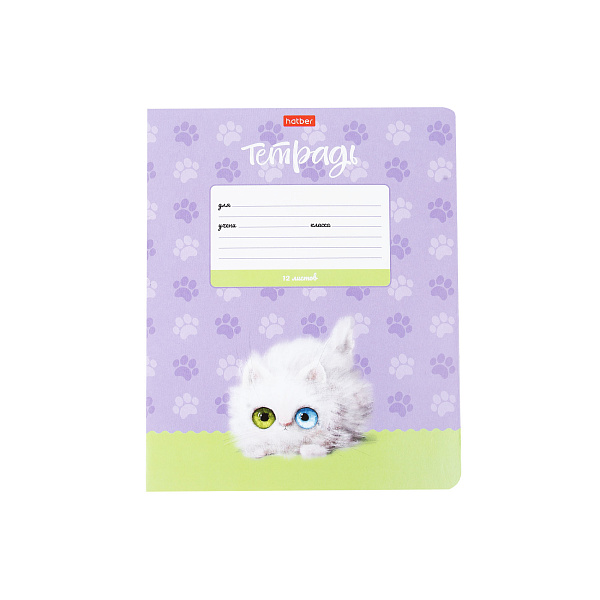 Обложку тетрадки украшает забавный белый котенок с глазами разного цвета, а также отпечатки кошачьих лапок на фиолетовом фоне. На фронтальной стороне есть место для имени и фамилии ученика, а на обратной стороне напечатан алфавит с заглавными и строчными буквами.