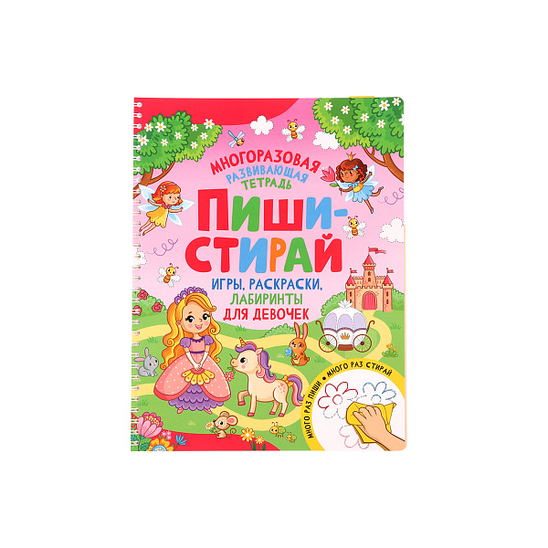 Эта многоразовая тетрадь создана специально для стимулирования детского развития в игровой форме. Обложка и страницы оформлены в волшебной тематике с изображениями фей, принцесс, кукол и бабочек, что делает ее привлекательной для маленьких девочек. Тетрадь содержит увлекательные загадки, креативные рисунки, занимательные лабиринты и игровые ребусы, которые поддерживают интерес и развивает когнитивные способности.