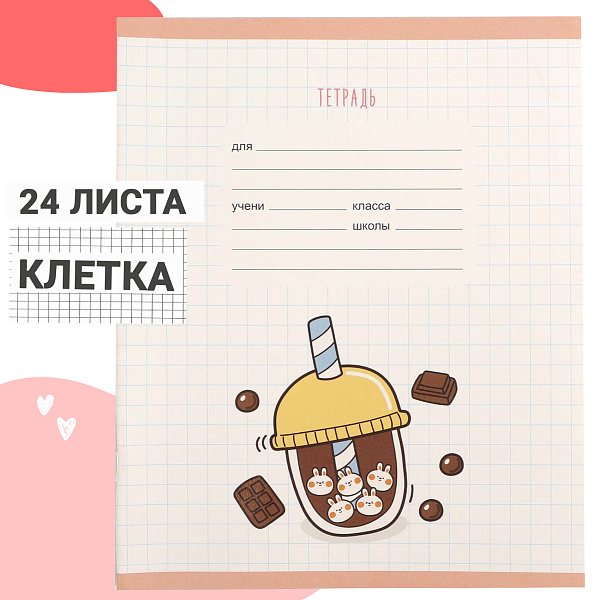 Школьная тетрадь в клетку — практичный и стильный инструмент для школьных будней. Обложка оформлена милым дизайном с изображением стаканчика с напитком и разметкой для подписи тетради. Сзади на обложке размещена таблица умножения и метрическая система мер, что является полезным справочным материалом для учащихся. Это позволяет вспомнить нужную информацию и значительно ускоряет выполнение школьных заданий.