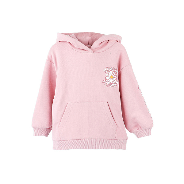 Толстовка для девочек в нежно-розовом оттенке с рисунками в виде цветов и надписей. Кофта создана для юных модниц, предпочитающих спортивный стиль. Она подойдет для прогулок в прохладную погоду, поездок на природу или походов в детский сад.