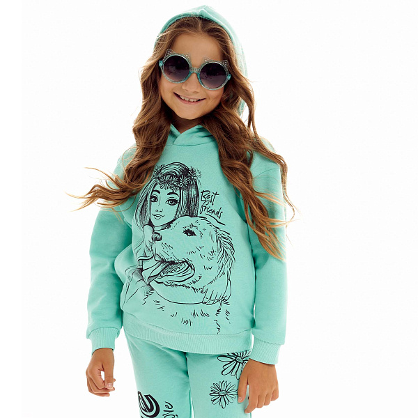 Толстовка – необходимая вещь для каждого ребенка, она удобная и практичная. Модель изготовлена в стиле оверсайз. Сидит свободно, не мешая играм, не стесняя движения. Сзади пришит объемный капюшон, который защитит ребенка от холода и сильного ветра. Широкие резинки вшиты на рукавах и поясе. Ткань ярко-голубого цвета с очаровательным рисунком мультяшной девушки с собакой на груди.