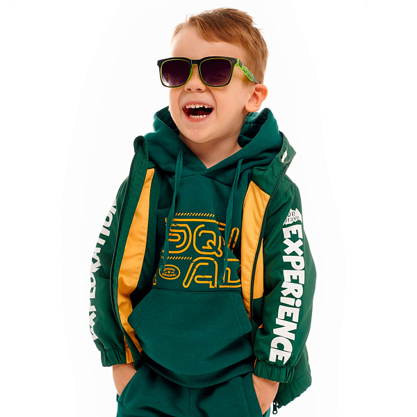 Удобная повседневная толстовка для мальчиков. Изготовлена из зеленой хлопковой ткани с добавлением полиэстера (80% хлопок, 20% ПЭ). На груди необычный орнамент желтого цвета. Сзади пришит объемный капюшон, который можно надеть при сильном ветре или во время дождя. На животе вместительный карман.