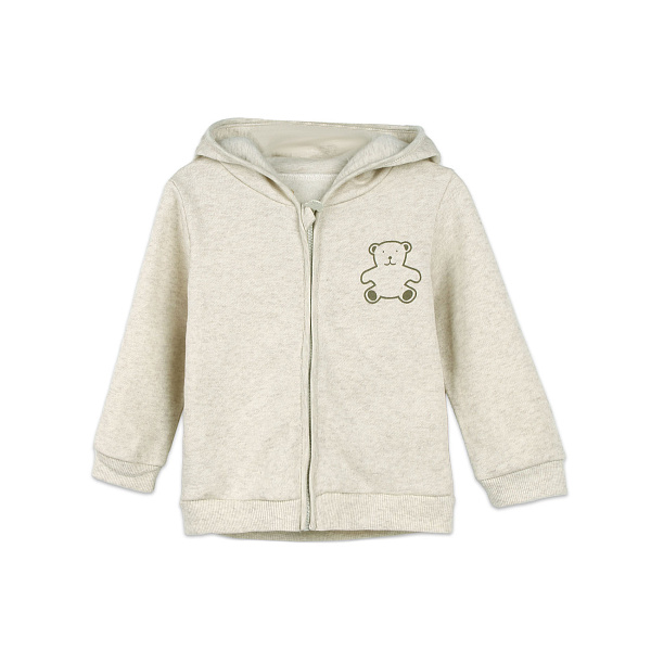 В прохладные осенние дни согрейте ребенка трикотажной кофтой с отложным воротником. Для пошива использован натуральный хлопок, материал мягкий и приятно прилегает к телу, хорошо пропускает воздух и бережно сохраняет тепло внутри. Низ кофты и рукава дополнены эластичными манжетами, а свободный крой не сковывает движения. Нейтральный бежевый цвет подойдет как мальчикам, так и девочкам. Воротник отложной, он защитит шею малыша от ветра и капель дождя. Капюшон глубокий, декорирован медвежьими ушками. Грудная часть украшена рисунком мишки. По центру расположена застежка-молния с бегунком в виде мишки. Рекомендовано для детей ясельного возраста.