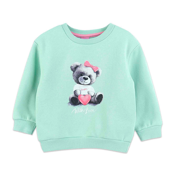 Толстовка подчеркнет нежный образ маленькой девочки, послужит удачным дополнением ее гардероба. Модель привлекает внимание изображением милого медвежонка, имеет свободный крой. Изделие удачно сидит на фигуре любого типа, не ограничивает движения, гармонично сочетается с брюками, джинсами, юбками и лосинами.