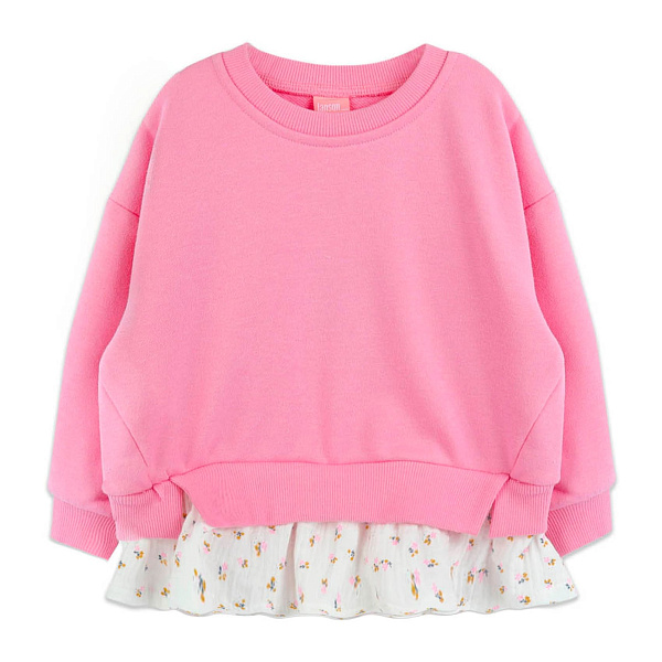 Розовая толстовка свободного кроя сшита из смесовой ткани (хлопок 60%, полиэстер 40%). Рукава и низ толстовки имеют широкие эластичные резинки, обеспечивающие прилегание к телу и защиту от холодного ветра. Округлая горловина также отделана трикотажной резинкой. Стильный акцент добавляют рюши из ткани в цветочек, пришитые по низу модели.
