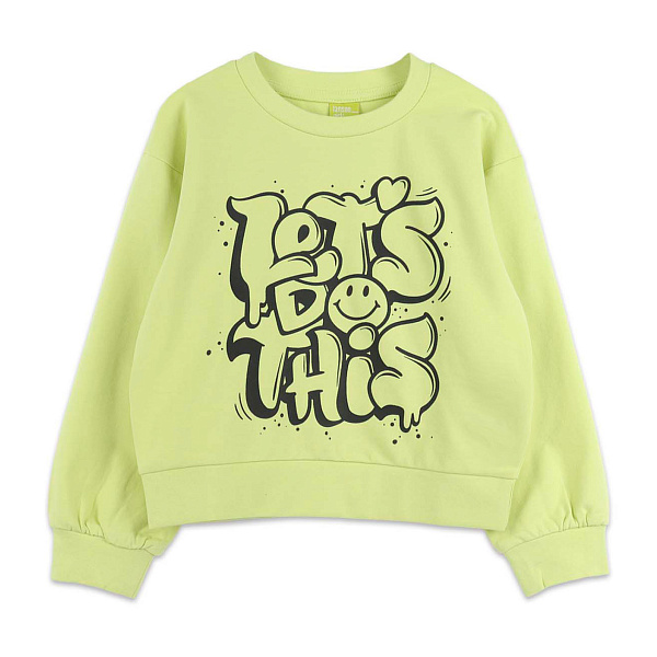 Легкая детская толстовка для девочек на каждый день. Изделие в насыщенном салатовом оттенке с черной надписью на груди. Она свободно сидит и не стесняет движения. Широкие и эластичные резинки на рукавах и по нижнему краю не дают вещи задираться и при этом не сдавливают тело и не доставляют дискомфорт.
