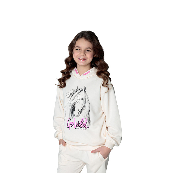 Модная толстовка с глубоким капюшоном украшена изображением лошади. Модель предназначена для девочки на повседневные наряды, поэтому толстовка комфортна в ежедневном ношении. Это полезное приобретение для прохладной погоды и вечерних прогулок. Для пошива использован мягкий трикотаж, в составе которого использовано 60% хлопка, 40% ПЭ. Такая ткань устойчива к износу и деформации, не закатывается, легко отстирывается, быстро сохнет. Материал не препятствует естественной циркуляции воздуха, не вызывает аллергической реакции и раздражения на коже. Рекомендовано для детей дошкольного и школьного возраста.