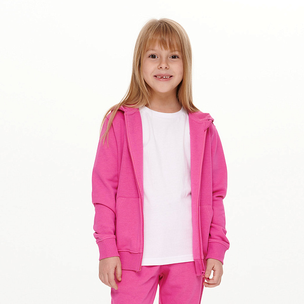 Толстовка для девочек выполнена в ярком оттенке фуксии, который добавляет оригинальности и красок в повседневный гардероб. Дизайн с капюшоном и застежкой-молнией обеспечивает практичность и удобство в носке.
