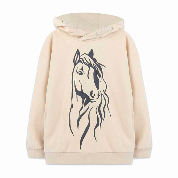 Легкая толстовка удачно дополнит гардероб любой девочки, станет одним из самых востребованных предметов одежды. Модель имеет свободный крой, удобный капюшон, трикотажные манжеты и резинку по нижнему краю. Она хорошо сидит на фигуре любого типа, универсальна в подборе сочетаний. Изюминкой изделия является схематичное изображение лошади, нанесенное на груди. Рисунок эффектно выделяется на нейтральном фоне, создает определенное настроение.