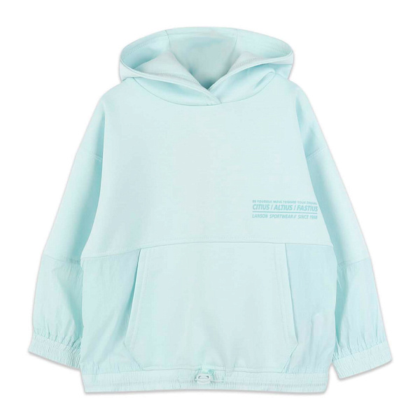 Легкая летняя толстовка для девочек – это идеальный вариант одежды для прохладной погоды. Изделие яркого голубого цвета. Модель с объемным и мягким капюшоном, защищающим от непогоды. Спереди – большой карман «кенгуру», куда малыш будет прятать руки или небольшие вещи. На конце кофты и ее рукавах пришиты широкие резинки, которые обеспечивают дополнительную защиту от сквозняков и ветра. Кроме того, ребенок сможет самостоятельно затянуть нижнюю часть с помощью эластичного шнурка.
