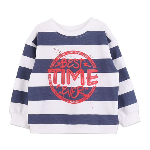 Легкая толстовка для мальчика пригодится ребенку на прогулке в пасмурный летний день, а также ее можно поддеть под теплую одежду в качестве дополнительного утепляющего слоя. Модная одежда в сине-белую полоску смотрится очень стильно. Спереди толстовка декорирована крупным принтом красного цвета.