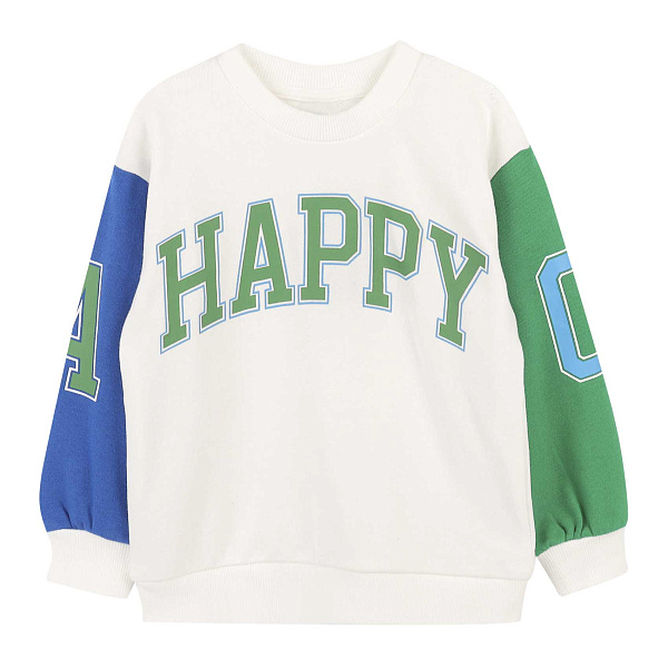 Свитшот в спортивном стиле для мальчика сочетает комфорт и яркий дизайн. Основная часть выполнена из мягкого белого материала, что придает изделию свежий и аккуратный вид. Яркие рукава синего и зеленого цвета создают оригинальный акцент, добавляя в образ динамику.