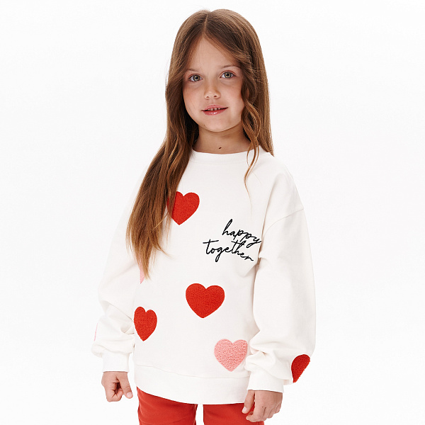 Белый свитшот с сердечками – это сочетание стильного дизайна и высокого качества материалов. Ткань состоит на 95% из хлопка и на 5% из эластана. Благодаря такому составу свитшот хорошо сидит на теле и не ограничивает движений ребенка, не вызывает раздражения на коже и позволяет ей дышать. Манжеты на рукавах и по нижнему краю изделия обеспечивают плотное прилегание, защищая от холода. Свитшот украшен яркими объемными сердечками розового и красного цвета.