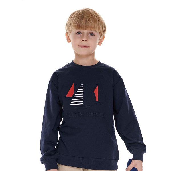 Толстовка в морском стиле для мальчика станет отличным дополнением гардероба юного искателя приключений. Выполнена в темно-синем цвете. Она привлекает внимание оригинальным дизайном с изображением парусов. Три паруса — черный, красный и полосатый — создают яркий акцент, а надпись «ENJOY THE ADVENTURE» подчеркивает дух исследования и открытий.