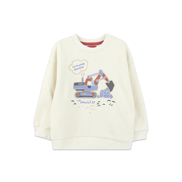 Легкая толстовка с длинным рукавом служит незаменимым элементом гардероба любого мальчика. Она гармонично сочетается с любыми брюками и шортами, обеспечивает ребенку комфорт во время подвижных игр и спокойных занятий. Модель имеет свободный крой, трикотажную резинку по нижнему краю и манжеты. Такое решение гарантирует удачную посадку на фигуре любого типа. Для оформления выбрана нейтральная цветовая гамма. Украшением служит графическое изображение экскаватора на груди.