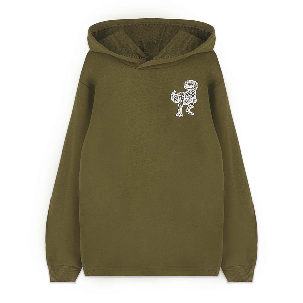 Приятный оливковый цвет изделия делает его универсальным для повседневной носки. На груди располагается стильный принт с изображением динозавра, который обязательно понравится юным любителям приключений. Толстовка отлично подойдет для активного отдыха и прогулок на свежем воздухе.