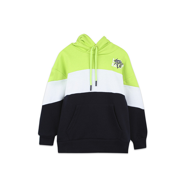 Толстовка сшита из ткани трех цветов, которые эффектно сочетаются между собой. На груди приклеена небольшая картинка в виде надписи, а на животе пришит дополнительный карман. Кофта относится к спортивному стилю. Она обязательно понравится юным спортсменам или ребятам, которые веду активный образ жизни.