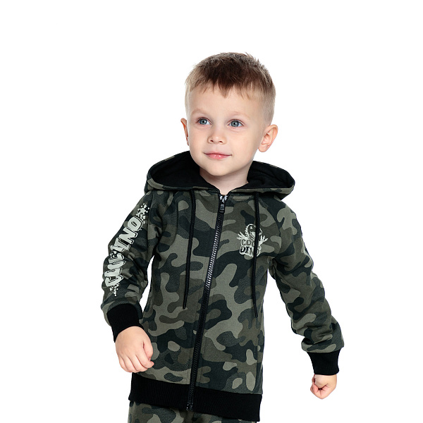 Утепленная толстовка изготовлена из хлопка с добавлением полиэстера. Комбинация материалов позволяет ткани дышать, бережно сохранять тепло и мягко прилегать к телу. Внутренняя подкладка мягкая и не пропускает холодный воздух. Крой толстовки свободный и не сковывающий движения. Глубокий капюшон с завязками укроет голову от холодного ветра. Низ кофты и длинных рукавов дополнен эластичными черными манжетами, они плотно прилегают к коже и не пропускают холодный воздух. Для застежки использована сквозная молния, по бокам кофты небольшие карманы. Расцветка в камуфляжном стиле, рукав и грудная часть украшены бежевым принтом с динозавром и надписями. Рекомендовано для детей ясельного возраста.