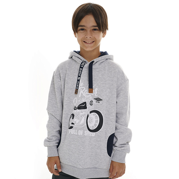 Основной цвет — светло-серый. Изнанка капюшона — черная. Спереди на толстовке располагается крупный рисунок в виде велосипеда и надписей. Резинки на рукавах и по низу толстовки серые, на карманах — черные. На капюшоне предусмотрена кулиска. Шнурок выбран черный, с белыми надписями.