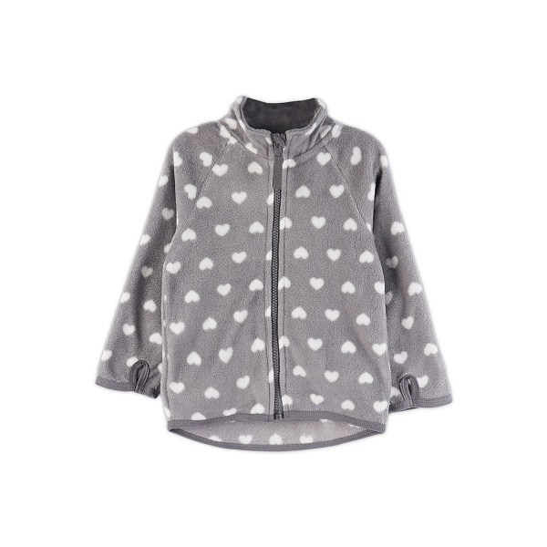 Теплая толстовка из мягкого флиса станет полезным дополнением сезонного гардероба девочки дошкольного возраста. Модель с высоким воротом без капюшона успешно справится с функцией верхней одежды или нижнего слоя. Она имеет свободный крой и разъемную молнию. Рукава и низ декорированы тесьмой. В качестве украшения использованы изображения сердечек, разбросанных на нейтральном фоне.